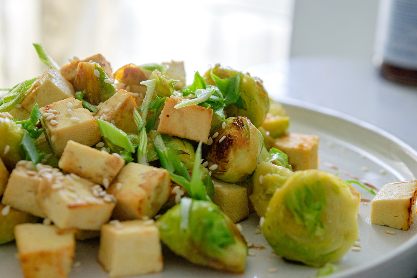 А теперь про вкус. Брюссельская капуста на сковороде приобретает легкую карамельную корочку и остается чуть хрустящей внутри. Рыбный соус дает приятную умами-глубину — никакого рыбного привкуса, только насыщенность. (Ниже есть фото соуса, который я обычно использую.) Тофу впитывает все соки и становится нежным, а лимон и кунжут при подаче добавляют свежести. Я еще люблю плеснуть гранатового соуса — получается вообще красота.